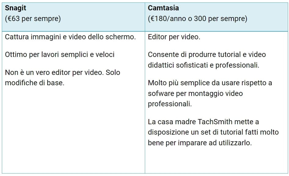 63 euro per Snagit è un regalo. 300 euro per Camtasia sono molti? Se lo usi poco si. Se lo usi spesso no. Un servizio professionale esterno per produrre video didattici non costa mai meno di 2-3.000 euro al minuto (io di certo non muoverei un dito per meno). In USA si va sui $ 6-7.000 al minuto.