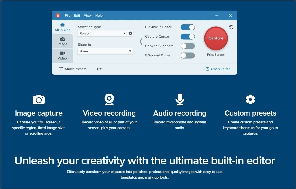 Ma se qui qualcosa di più completo puoi usare il notissimo Snagit, sempre prodotto dalla TechSmith, come Camtasia e che ha milioni di utilizzatori.